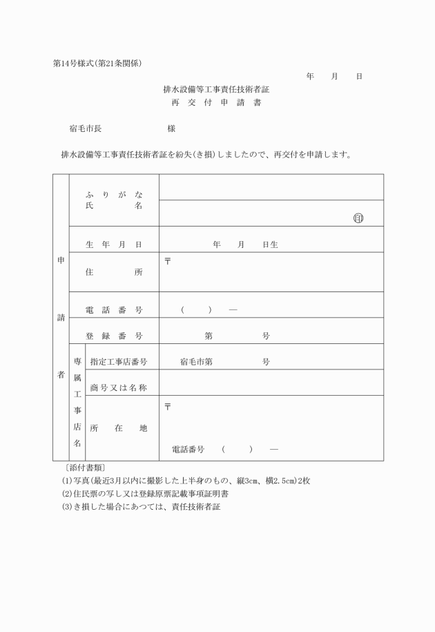 第21条 責任技術者は、責任技術者証を紛失し、又はき損したときは、排水設備工事責任技術者証再交付申請書(第14号様式)により市長に申請して責任技術者証の再交付を受けることができる。