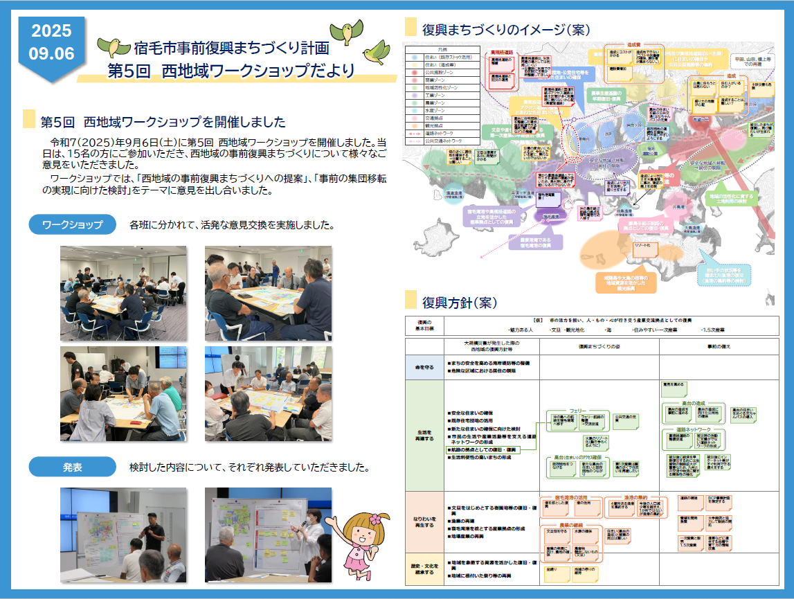 宿毛市では、南海トラフ巨大地震が発生した際に迅速な復旧・復興を実現するため、復興の手順や災害後の復興の姿を事前に検討する「事前復興まちづくり計画」の策定を進めています。