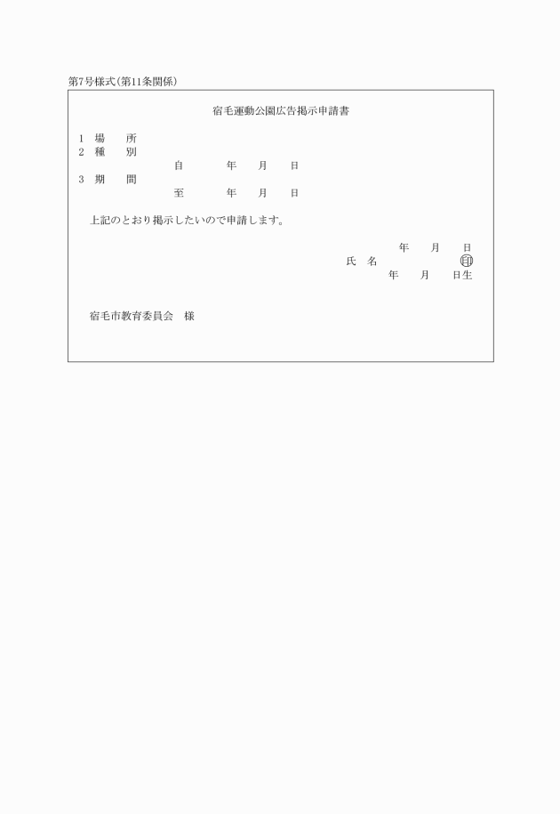 第3条 宿毛運動公園利用の許可を受けようとするものは、利用許可申請書(第1号様式)を教育委員会に提出しなければならない。