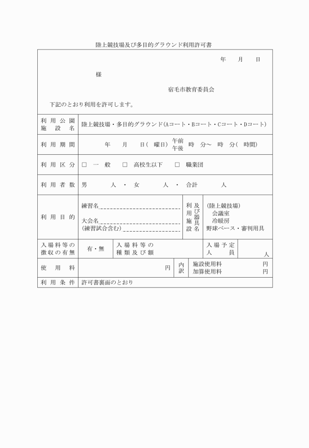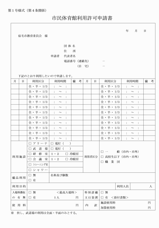 第4条 宿毛市総合運動公園利用の許可を受けようとする者は、利用許可申請書(第1号様式)を教育委員会に提出しなければならない。